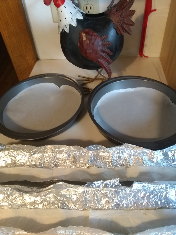 The rooster in the back is a watering can. Its beak has a very controllable flow. I used that to rewet the paper towels inside the foil bands; shown before being wrapped up again. Also note the parchment paper rounds! They’re a bit large, but they worked just fine.