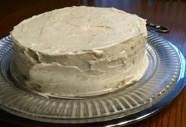 I still need to work on frosting skills. I trimmed the sides to get a cylinder. I smushed the extra together and it put in the middle to cover the dent. It is tasty, but far too dense to be “cake”.