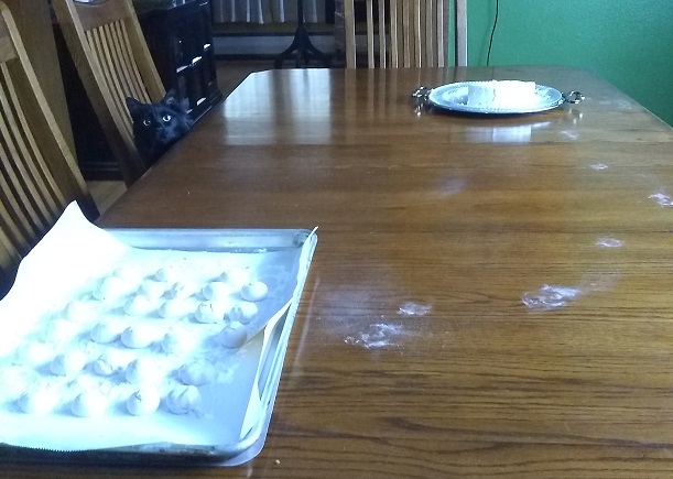 Despite powdered sugar being very obvious on the paws of a black cat, there was no evidence. A cat licking its paws, who’d a thunk?