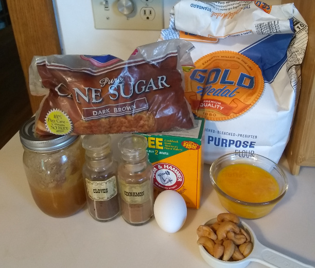 Of course, no instructions. Conspicuous by its absence: An oil – no butter or lard. I have all of this, but two pounds of brown sugar? That’s a lot of cookies. Quartering it seems reasonable, but how does one quarter six eggs? Thirding it causes even more grief with the teaspoons. Since I’m trying to learn as well as bake, let’s be daring and say that a quarter of six eggs is one egg plus one yolk (I still have leftover yolks from all the cake frosting). Since I’m going to be picking the nuts out of trail-mix, I’m going for cashews – and I’m going to chop them into small chunks, not spice-grind or mortar/pestle them to dust.