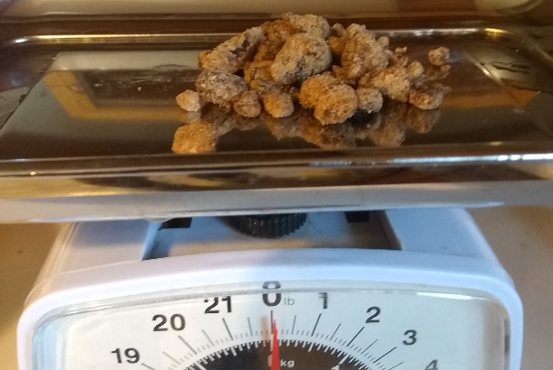 Quite a few rocks, but the weight seems fairly negligible. Let’s go for it. Another change of plan: The 1.5 eggs don’t seem to be enough liquid to mix with all that sugar, so adding the water and soda at the same time. I didn’t boil the water. My tap water is over 160 (no children in the house), so I figured that was hot enough. My concession to high-altitude was using two tablespoons of it. I microwaved the honey (about 100 seconds in 20 second increments) so it would pour. This created a sticky mess in the mixer. Instead of chopping the nuts (I don’t have one of those old-school choppers), I put them in a Ziplock bag and beat them with a mallet; worked great. I added flour 1/4 cup at a time. At 1 1/2 cups, the mixer was starting to work to mix. I added one more 1/4 cup. That would be about six cups in the original recipe.