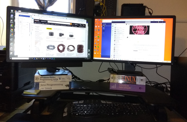 This computer is aging; aside from the DVI video output, it has spinning rust disks. It has served me well, but backing it up before I moved, I noticed it has my tax returns since 2011 on it. Ten years is a long time for a computer – and it was only $600 at Sam’s Club at the time. I went a bit crazy with the new one. I’ll save the embarrassing details for when it arrives – in all its spinning RGB glory. The old monitors also need an upgrade. That arrived, first: