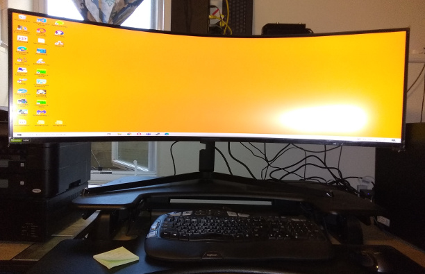 Unfortunately, whatever video hardware is in this computer cannot drive it properly. The entire point is that it is both of the others, so it has a 32×10 (as opposed to 16×9) aspect ratio. The best the computer can do is above, which is one of the small monitors stretched to twice its width. I have no idea if it is the video card, the DVI port, the DVI-to-HDMI dongle, the HDMI version, or whatever. I don’t really care – other than being sad that this spectacular monitor has become a decoration – displacing the festive Halloween decorations – on the credenza until the new computer arrives (scheduled to ship 1 Nov – it’s being built, now; I’m hoping that is a late, make-customer-happy-by-shipping-sooner date).