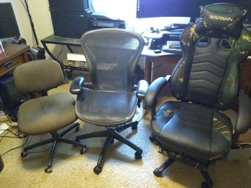 Apparently, I’ve gotten taller. I don’t remember what the first one cost, but it was expensive to me when I bought it, so let’s go with $150. The middle, Aeron chair was a going away present (thanks, Yuriy and Anna), but listed for $800 at the time. The right chair is brand new and cost about $250.