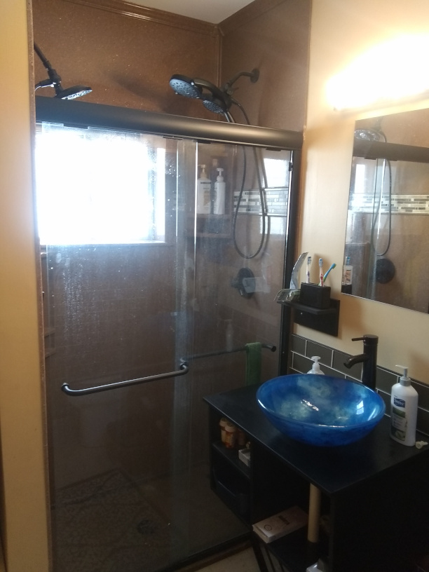 Then we got the washer hooked up – but were waiting on HVAC folks for the dryer vent. That has also been completed and we have a washer/dryer in our bathroom: