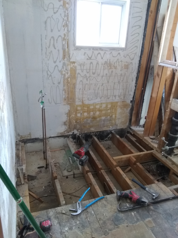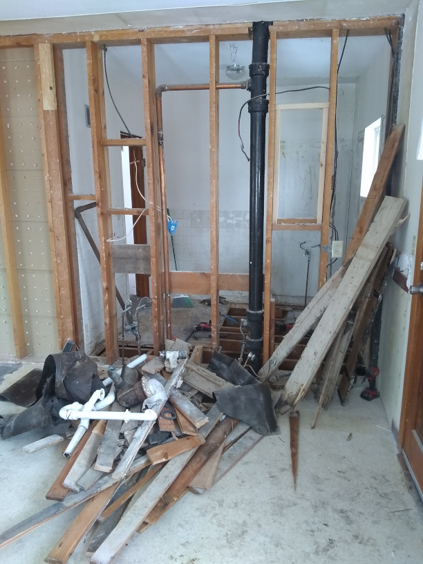 We have a hot tub and rarely took baths in Denver (where we had a wonderfully large and deep clawfoot tub), so why not remove the bathtub, put in a smaller shower stall, and put the washer/dryer in the bathroom? Why not, indeed. The first reason: The toilet needed to move in order to have reasonable access to the shower. The second reason: There is no piping or electricity where the laundry machines will go. The third reason: Money. We did it anyway.