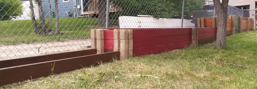 That’s bigger than it looks. From this angle, there’s a 2′ one out-of-frame, the 6′ one needs four more red 2x6s, an 8′ red one, 6′ of brown with red on top, a 6′ one, the green is 4′, and two 6′ beds to start it off. That’s 44 feet – about 18″ deep (foot long boards between the bricks).