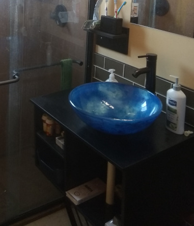 Imagine that you had just bought a vanity-and-sink combo from Lowes. You open the box and find it’s ready to slide in and hook up to plumbing. You’re very happy because the process is so easy. Now, imagine that you are me, who bought the bottom planning to throw away the top. “The [expletives deleted] top is attached to the base,” I said very calmly and reasonably while not bounding up and down.