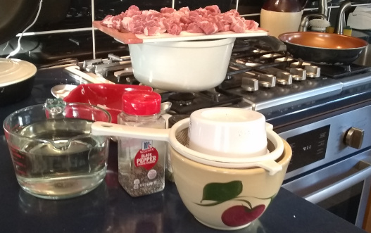 That’s it. Diced pork in the background, spices and liquids in the middle ground, and the pork blood being sieved as it thaws in the foreground.