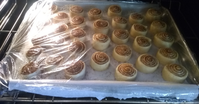 I rolled it out in half batches because I want 24 smaller ones not 12 big ones. I also put them on a half-sheet, not in a casserole dish. Second rise in progress…