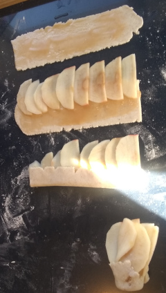 Meh. They taste fine, but not worth the effort – about two hours from “am I going to make these, today?” until “I can write the blog post while they cool.” I’ll try again, someday. I think slightly thicker pastry (so no pasta roller) and slightly longer at 400 before turning the oven down – and of course putting the apples in the other way.